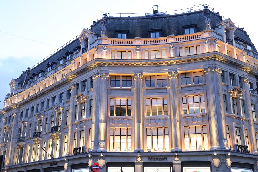 As case studies in the advantages of façade gommage®, the Oxford Circus building facade cleans demonstrate the key USPs of the process. Alitalia House, on the south-west corner of Oxford Circus, is now Microsoft’s flagship London store. Cleaning 4,000 sq. m. of Portland stone over just 12 nights in early 2019, all of the Beaux Arts colonnades and detailing of Sir Henry Tanner’s early 20th century architecture were restored to their original glory.